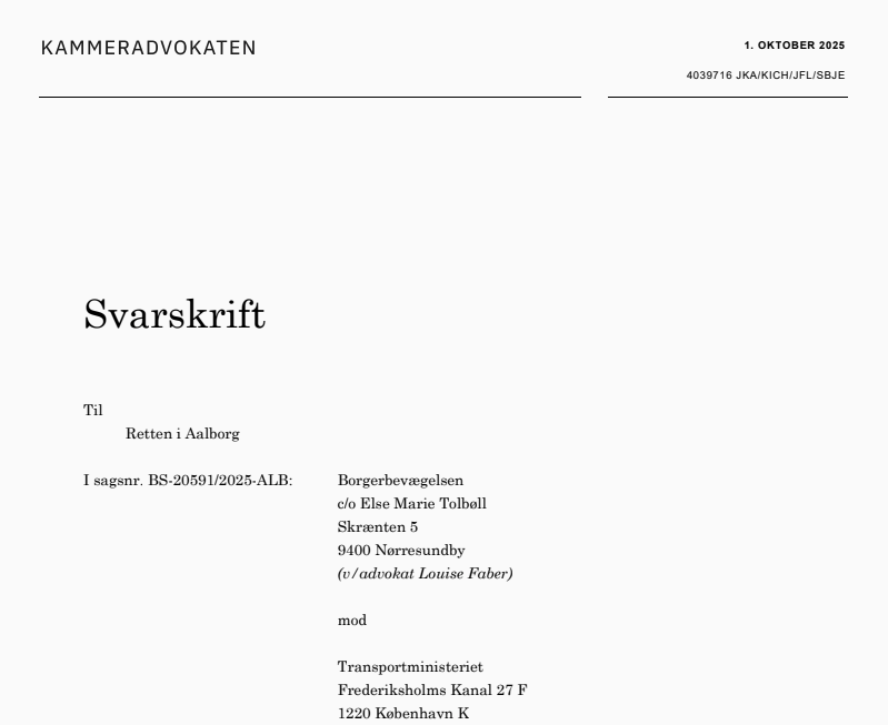 Borgerbevægelsens advokat, Louise Faber, har nu modtaget svarskriftet fra Kammeradvokaten. Opdatering følger - læs i mellemtiden selv svarskriftet her.