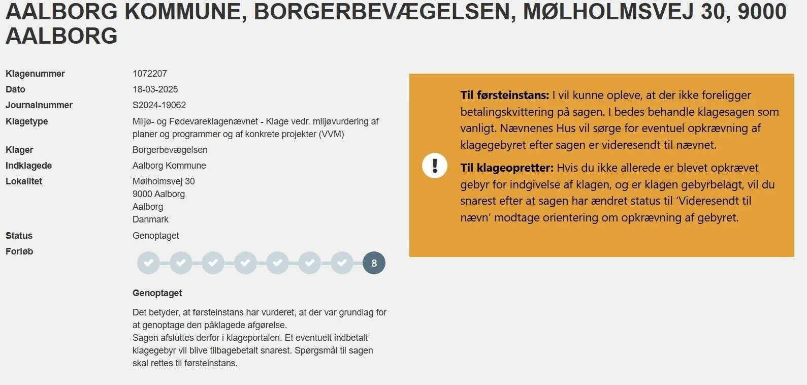 Aalborg Kloak A/S ønsker at opføre to gasballoner ved Rensningsanlæg Vest i Mølholm. Kommunens screeningsafgørelse lød først, at projektet ikke skulle miljøkonsekvensvurderes. Borgerbevægelsen klagede over denne afgørelse - og har nu fået medhold. Kommunen har erkendt sine fejl på grund af klagen, og har genoptaget sagsbehandlingen.