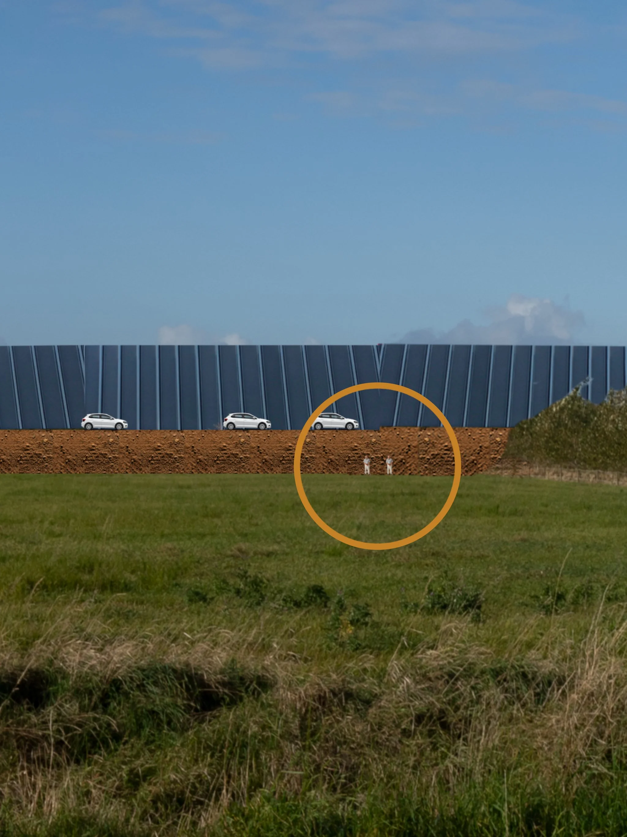 Biler vil reelt køre bag støjskærmene, men blot til illustration af størrelsesforholdet er biler og menneskefigurer indsat på visualiseringerne. At man er tvunget til at bruge så voldsomme støjdæmpende midler på en ny (omfarts)motorvej allerede i begyndelsen af vejprojektet, vidner om, hvor voldsom støjen bliver, og hvor kortsigtet og fejlagtig linjeføringen er.